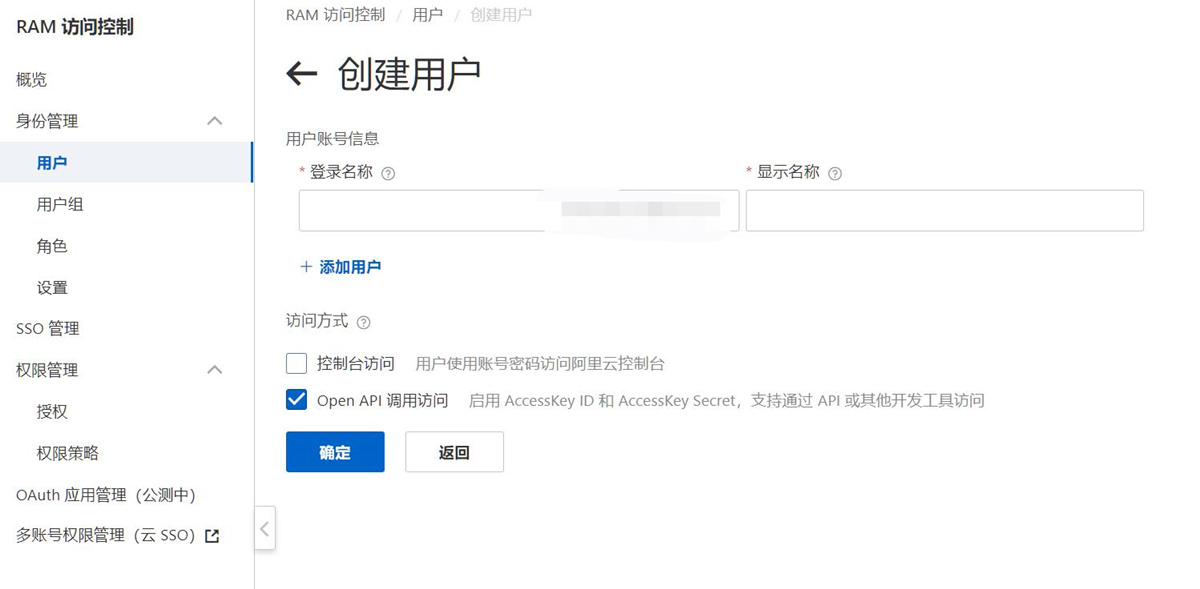 2、进入RAM访问控制台点击左侧用户,创建一个新的用户,登录名称可以根据自己的喜好进行填写(例如:ros),并将“Open API 调用访问”打钩。