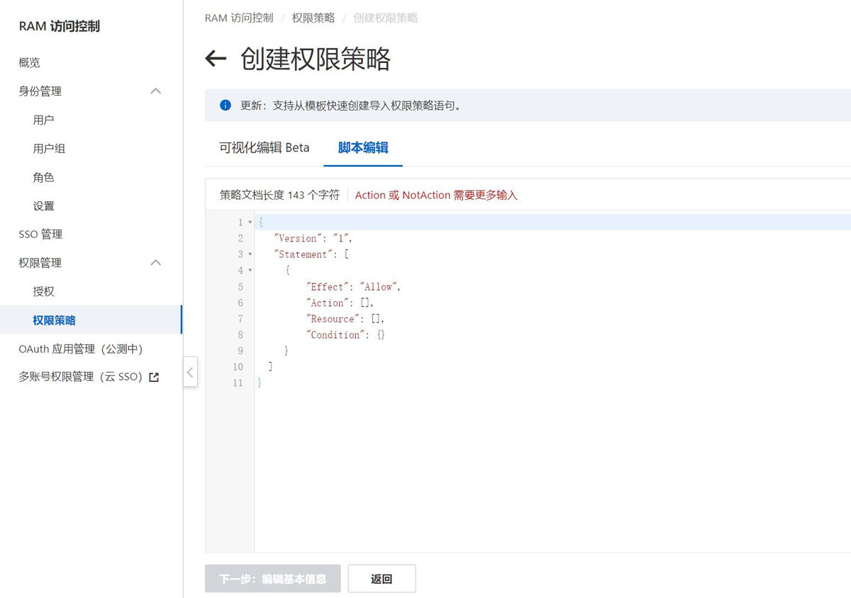 1、进入RAM访问控制台点击左侧“权限策略”,创建一个新的策略。