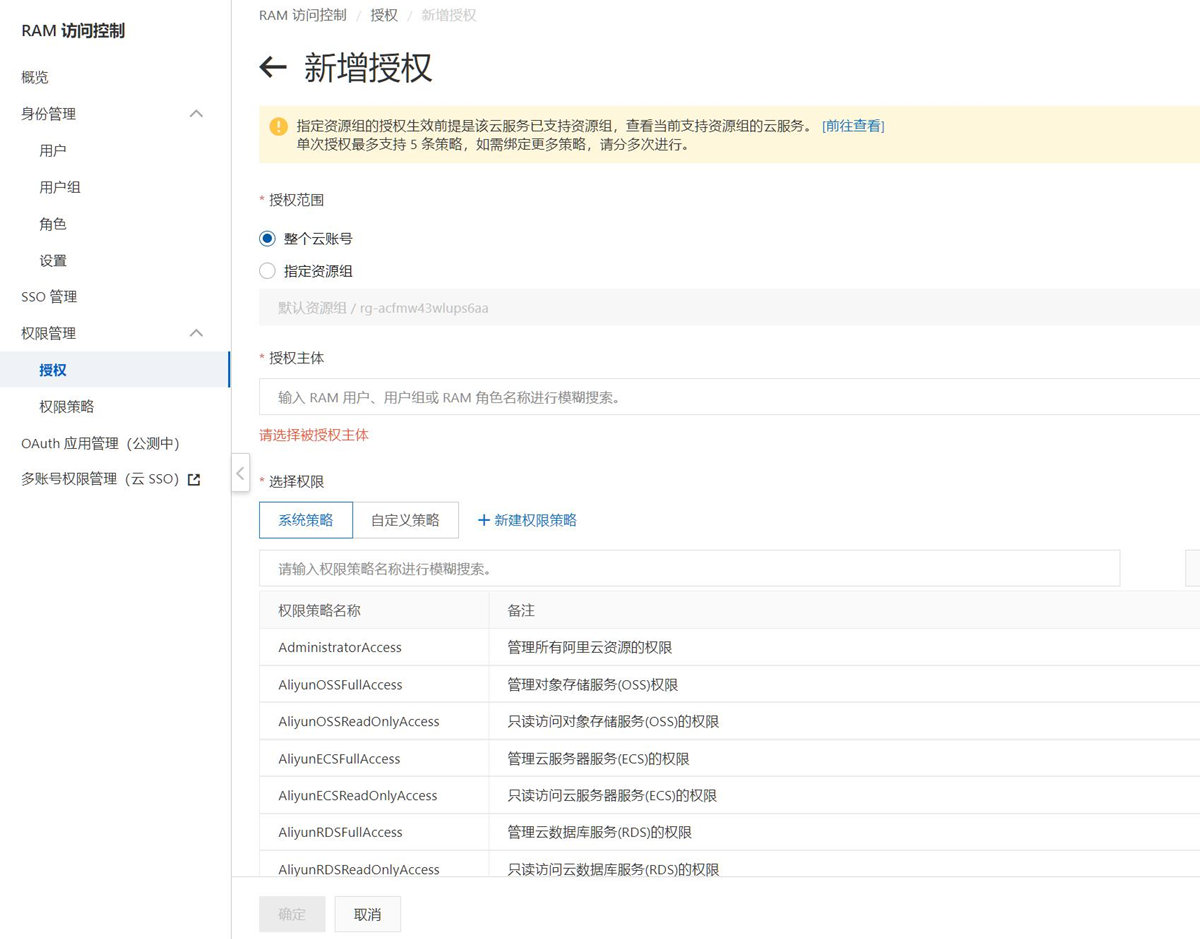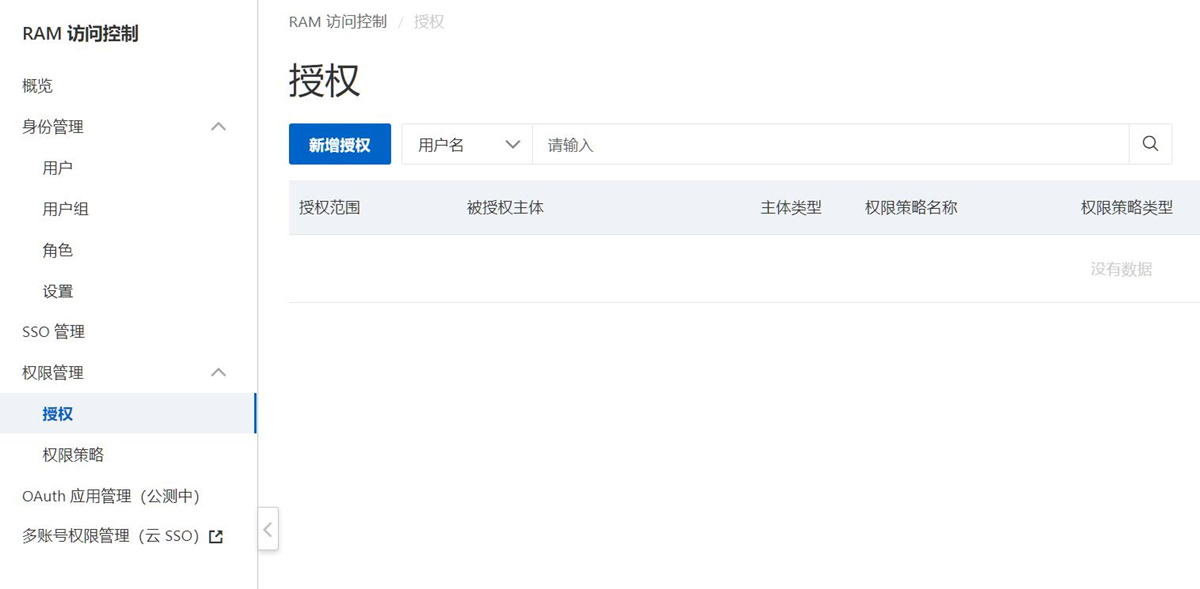 1、进入RAM访问控制台点击左侧“授权”,创建一个新的授权。