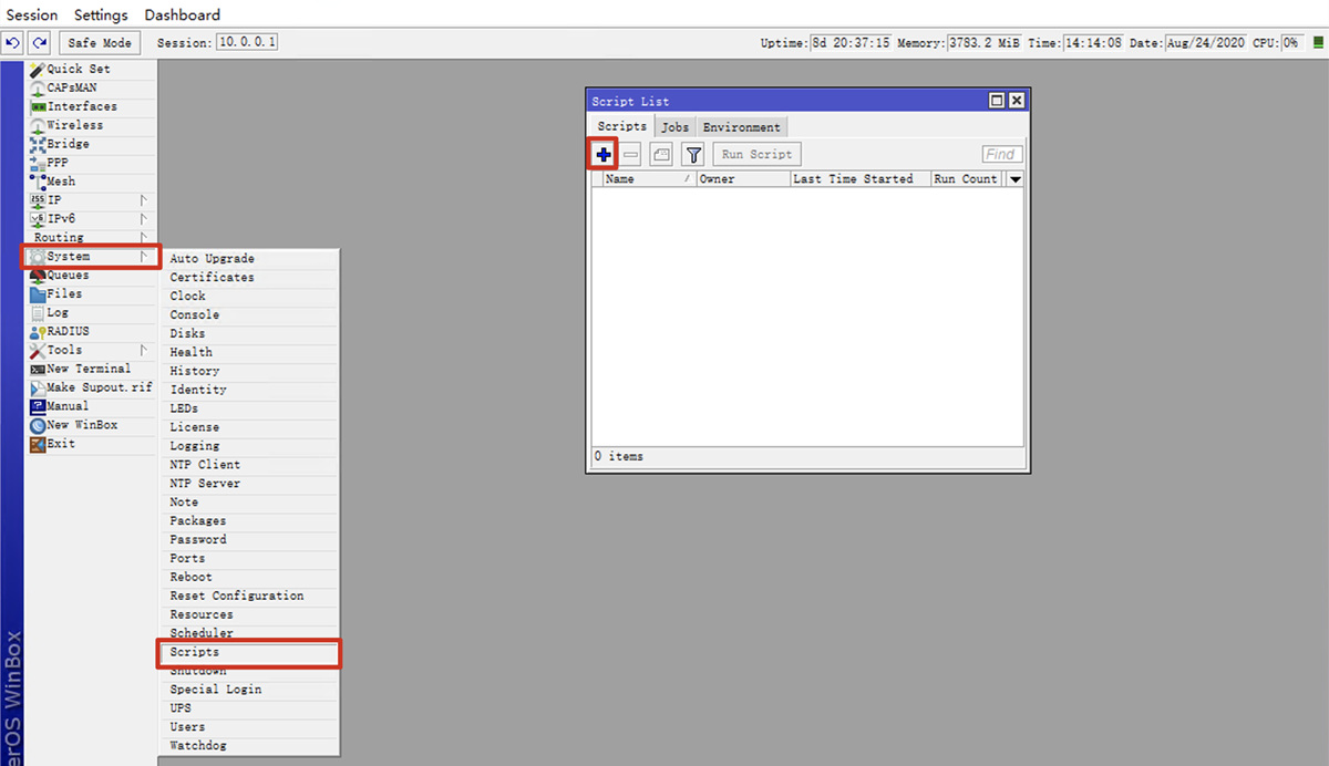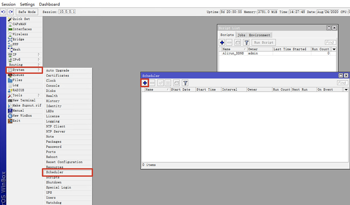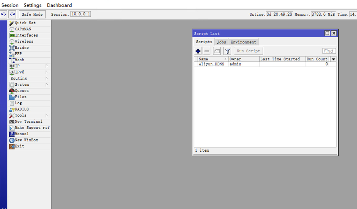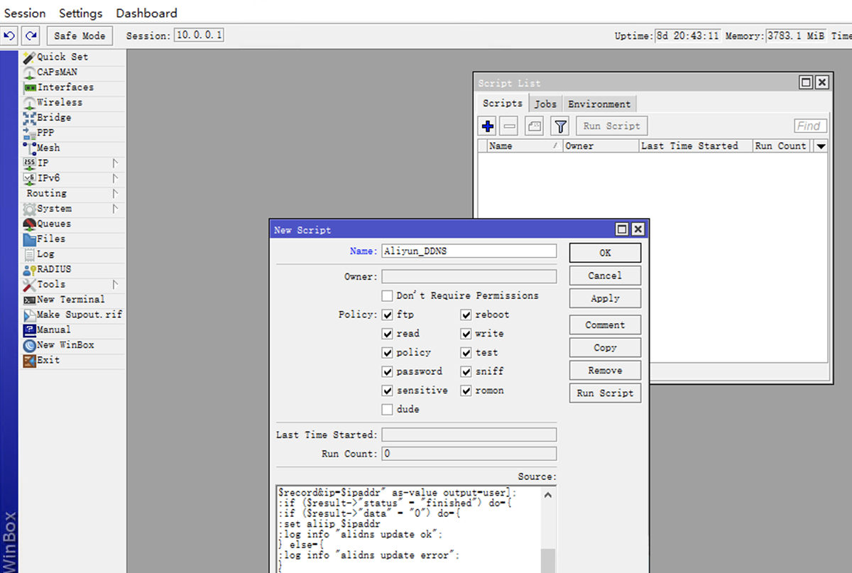 1、使用WinBox登录ROS,点击“System” -- “Scripts”,点击左上角蓝色“+”号,新增一个阿里云DDNS脚本。