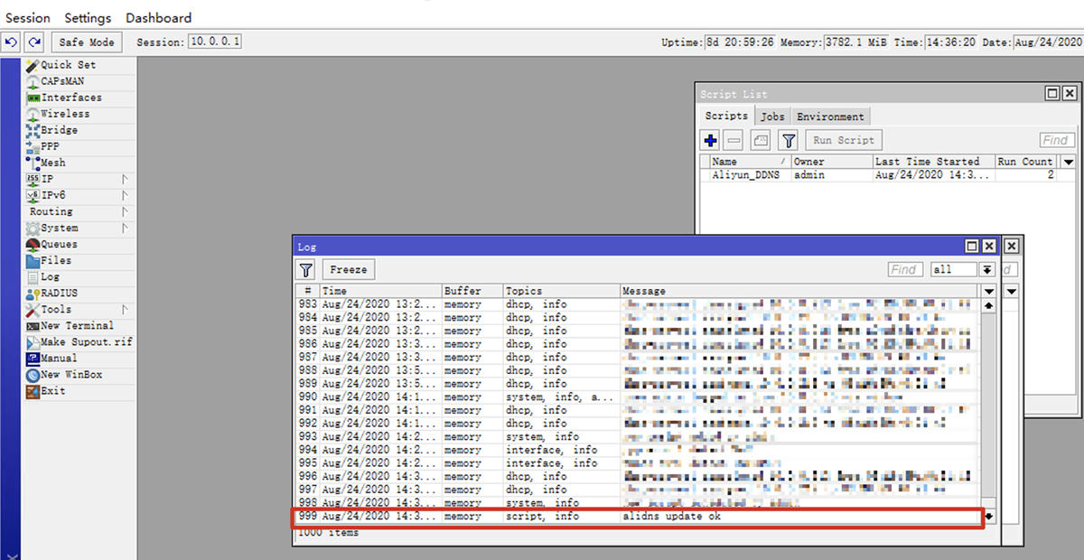 1、点击Log查看ROS日志,稍等一会儿即可看到,alidns update ok,表示ROS已成功定时执行脚本。