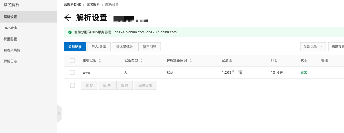 2、访问阿里云域名控制台查看域名解析记录,发现阿里云解析记录已变为ROS动态获取的IP地址。