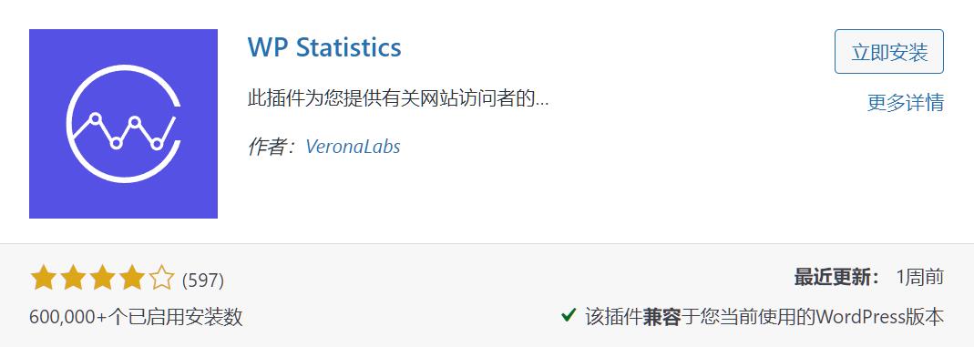 在 WordPress后台 >插件>安装插件,搜索 WP Statistics,安装并启用。
